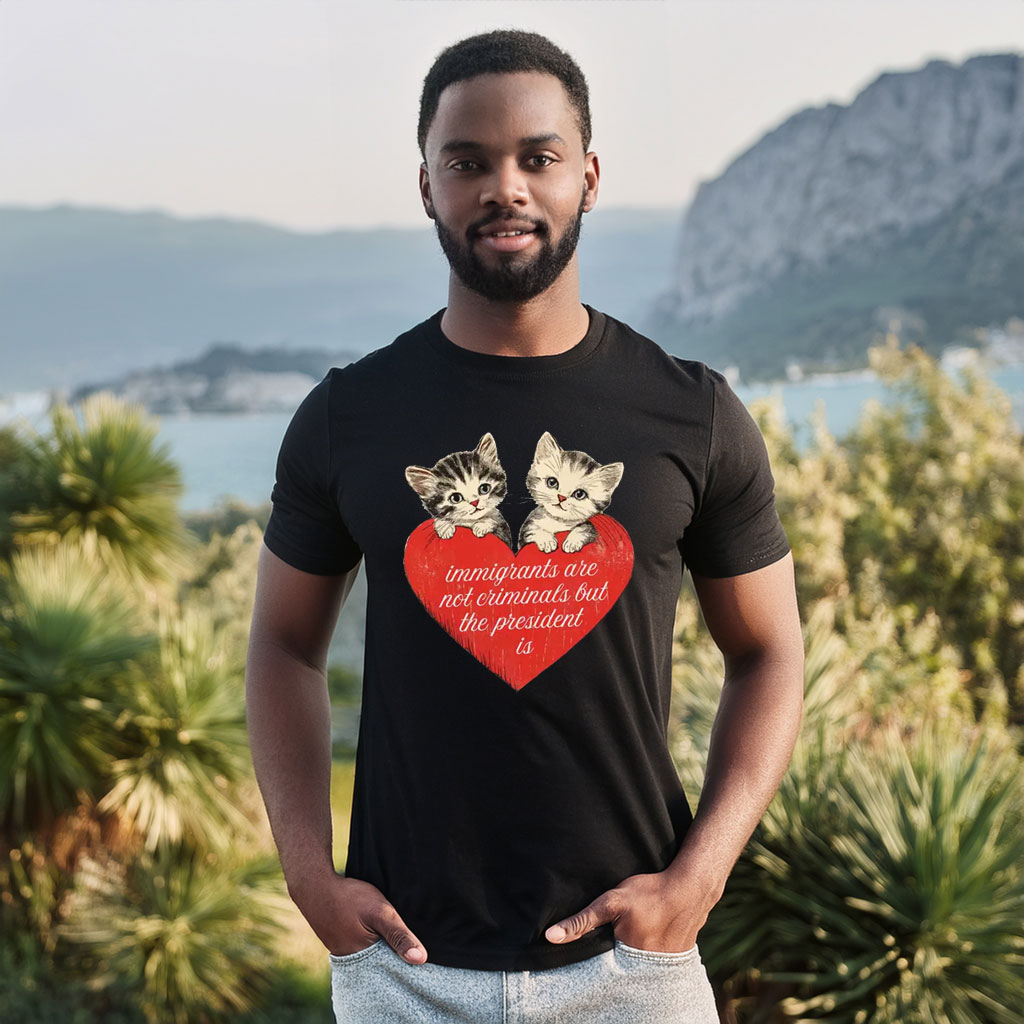 This shirt represents love as resistance and compassion as political action. Wearing it is a way to stand with immigrant communities, reject cruelty, and affirm that justice and dignity belong to everyone.