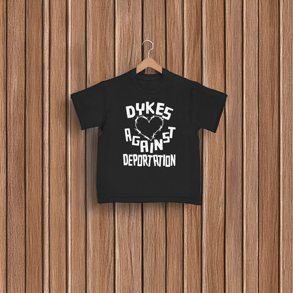 Bold “Dykes Against Deportation” slogan with barbed wire heart